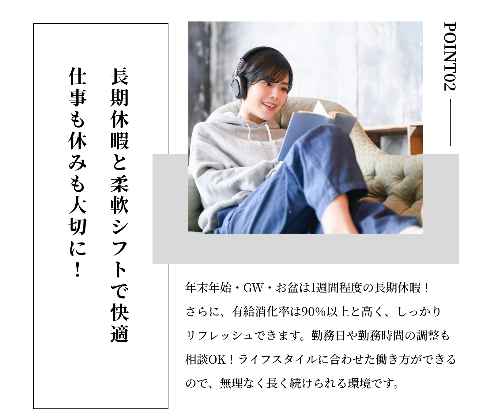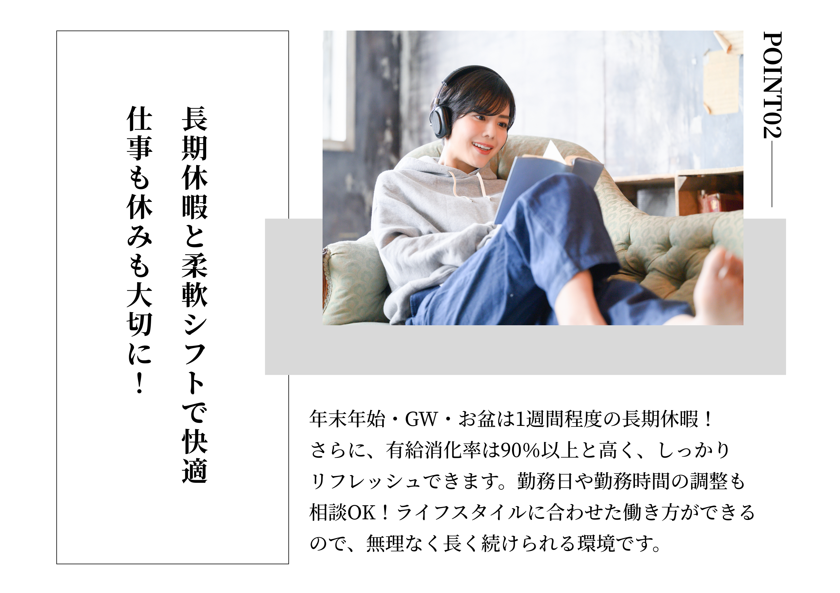 【休日】火曜日、金曜日、日曜日のいずれかの週休2日制 原則祝日は休み 【年間休日】120日 【有給休暇】6ヶ月経過後に10日付与 |